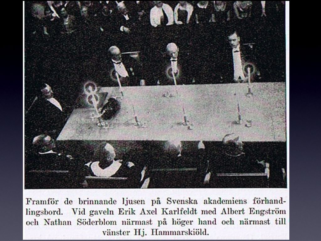 Så elever åt skaldekonstens eteriske gud de än är, så är de inte för fina att snusa! Så korrekt i detaljerna som Karlfeldt är, måste man befara att han inte hittat på det där med snusandet. Men vad hade han då för grannar vid bordet? Alltsedan 1913, då han blev Sekreterare och fick fast plats vid bortre bordsändan, hade han närmast sig på ena sidan herren till Grönsö i Uppland, den aktade gamle politikern Pehr von Ehrenheim, och på den andra sidan filosofiprofessorn Vitalis Norström.