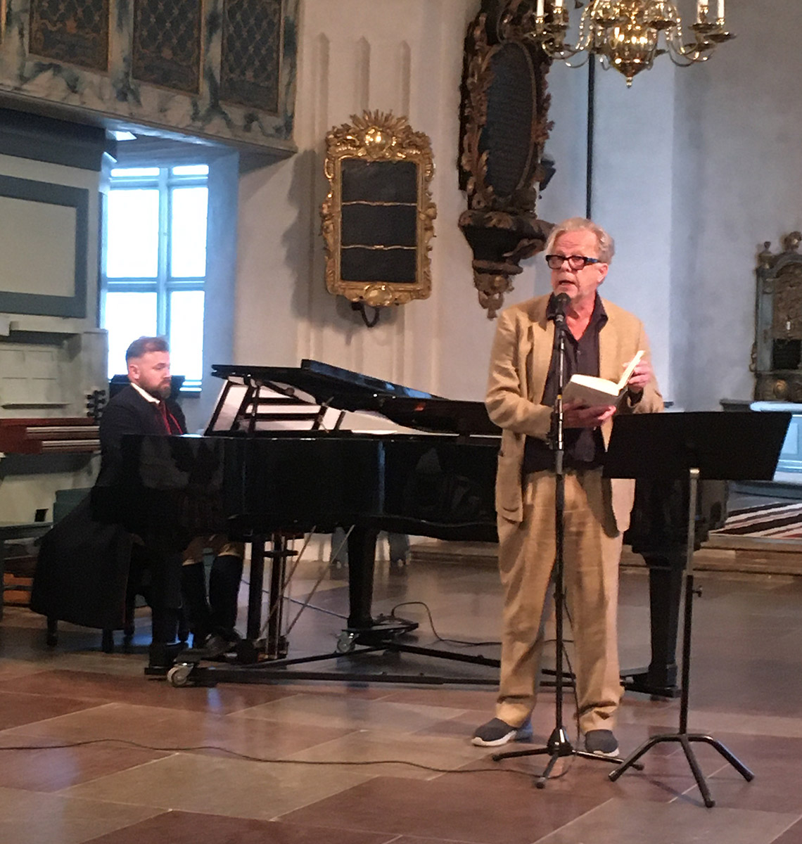 Mika Larsson väjde alltså inte för de drag i diktarens personlighet som kanske kan te sig lite mer kontroversiella, som hans kvinnointresse, präglat som det var av en tydlig erotisk underton. Erotiken kan, menade hon, ses som såväl hans gissel som musa. Detta drag kommer också till uttryck i en av hans mest kända och flerfaldigt tonsatta dikt ”Dina ögon äro eldar”, som till den fulltaliga publikens både hör- och synbarliga förtjusning lästes av Krister Henriksson och framfördes av Ann-Kristin Jones till pianoackompanjemang av Henrik Berg.
